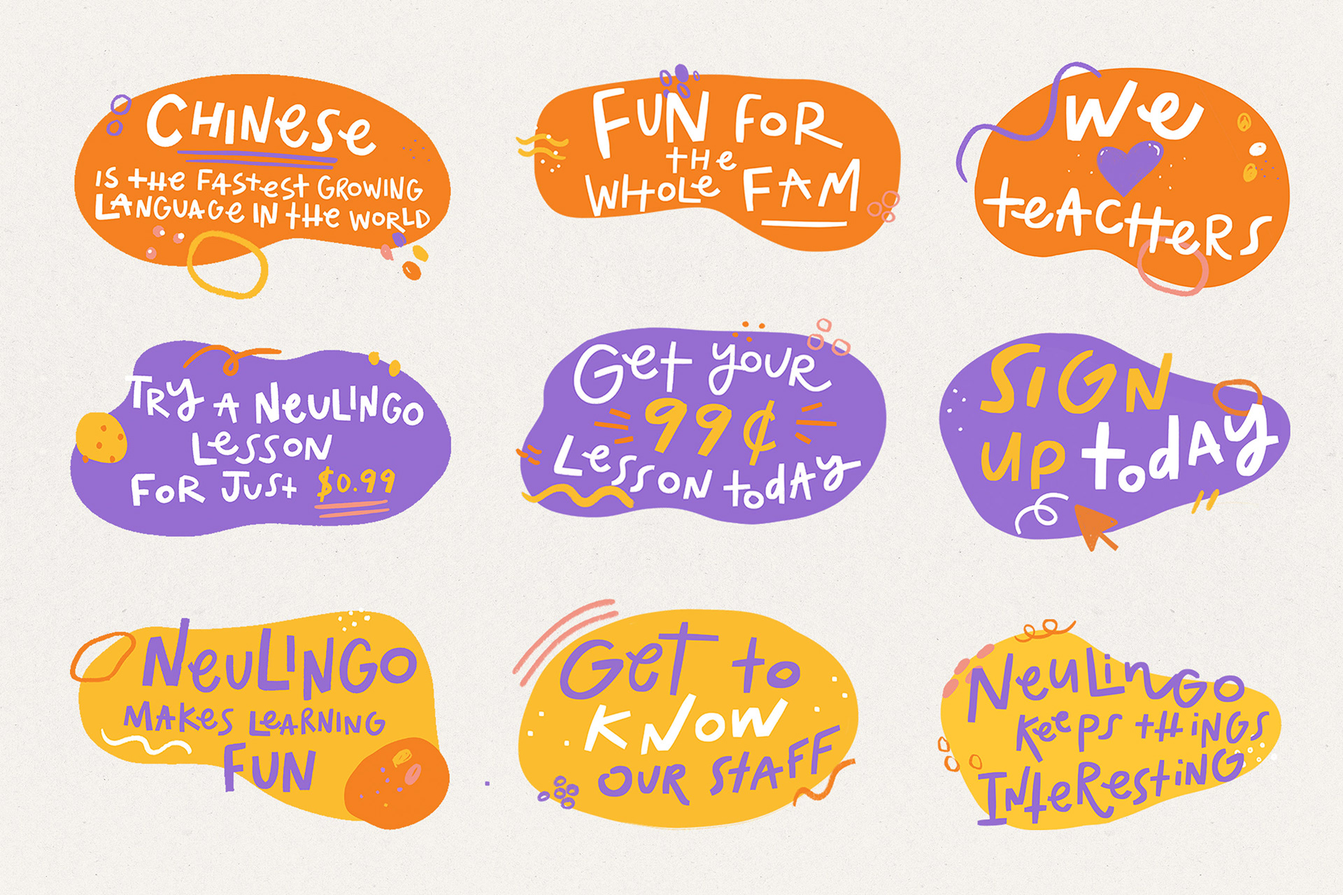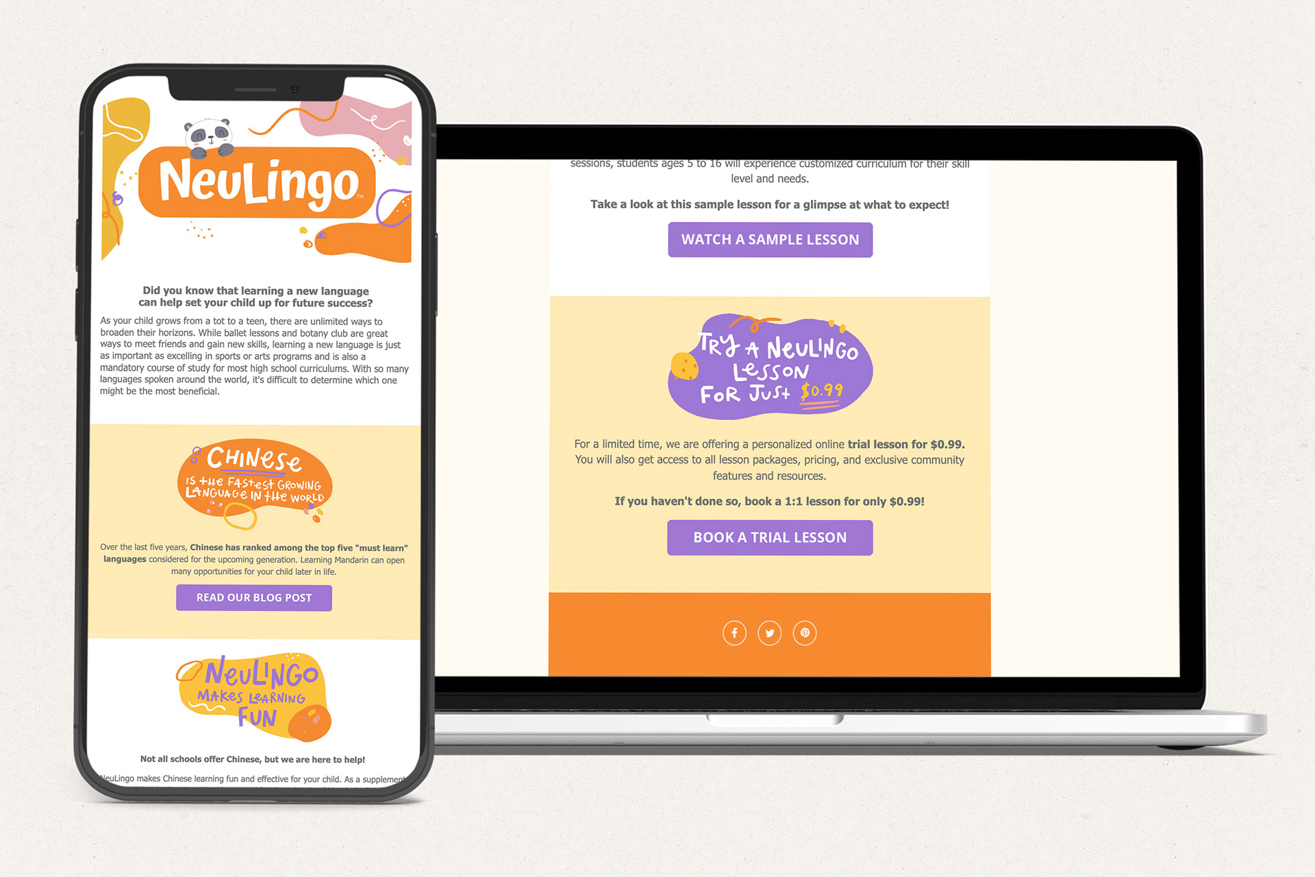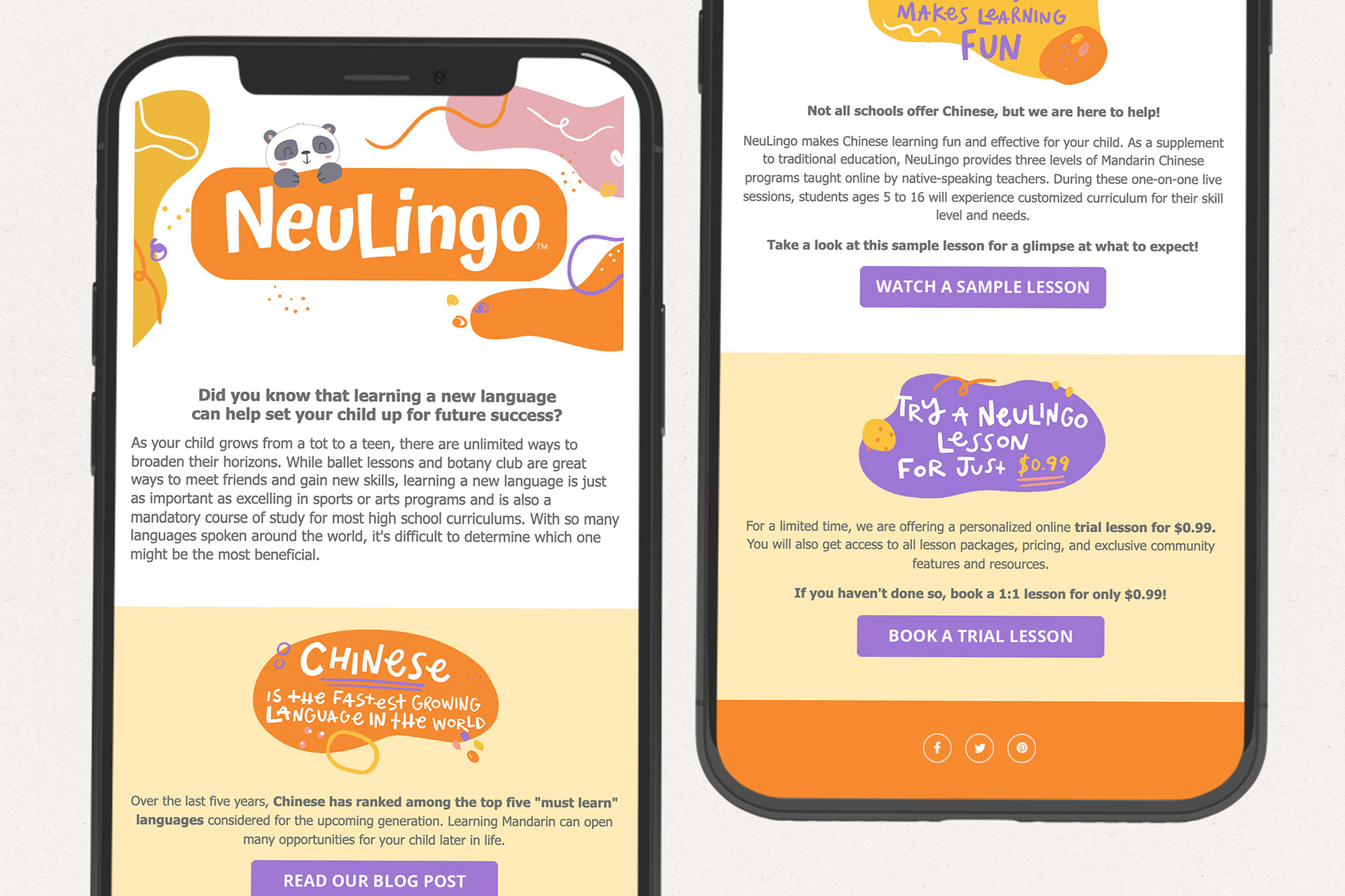 Design of the NeuLingo email campaign and marketing images featuring mascots Chengcheng the panda and Honghong the dragon.